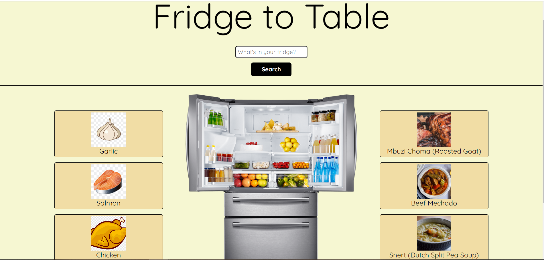 The App is called Fridge to Table and it is a simple application that gives users recipe ideas based on ingredients they have in their fridge (or pantry!). It utilizes a free recipe API called TheMealDB. This application was created during a pair programming challenge.